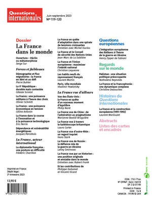 Alors que les tensions internationales se multiplient et que les bouleversements géopolitiques se succèdent, il est intéressant de s’interroger sur le rôle et l’influence de la France dans le monde actuel. En premier lieu, Questions internationales tente d’étudier les forces et les faiblesses du pays (en matière démographique, économique et technologique, politique et institutionnelle, militaire, etc.) avant d’analyser les ressorts de la puissance actuelle de la France (posture diplomatique, rôle dans les organisations internationales, diplomatie culturelle et soft power, rôle au sein de l’Union européenne). Et pour finir, cinq personnalités étrangères apporteront un éclairage de l’extérieur sur la façon dont la France est perçue dans le monde. A noter un entretien avec Michel Duclos, ancien ambassadeur et Robert Frank, historien.