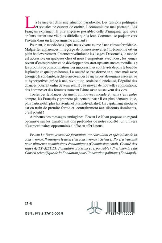 Pourtant, le monde dans lequel nous vivons tourne à une vitesse formidable. Malgré les apparences, il regorge de bonnes nouvelles ! L’économie est en plein bouleversement : Internet révolutionne les usages. Désormais, le monde est accessible en quelques clics et nous l’emportons avec nous ; les jeunes rêvent d’entreprendre et de développer des start-ups aux succès mondiaux ; les produits de consommation hier inaccessibles sont livrés depuis le bout de la planète en quelques heures. La société se transforme en silence mais avec énergie : la solidarité, si chère au cœur des Français, est désormais associative et hyperactive ; grâce à une révolution scolaire silencieuse, l’égalité des chances pourrait enfin devenir réalité ; au moyen de nouvelles applications, des hommes et des femmes trouvent l’âme sœur ou sauvent des vies.