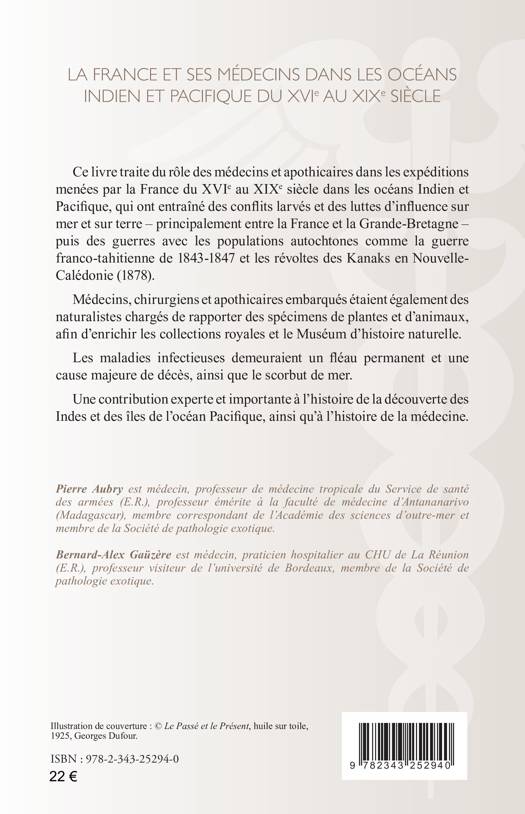 Ce livre traite du rôle des médecins et apothicaires dans les expéditions menées par la France du XVI e au XIXe siècle dans les océans Indien et Pacifique, qui ont entraîné des conflits larvés et des luttes d’influence sur mer et sur terre, principalement entre la France et la Grande-Bretagne, puis des guerres avec les populations autochtones comme la guerre franco-tahitienne de 1843-1847 et les révoltes des Kanaks en Nouvelle-Calédonie (1878). Médecins, chirurgiens et apothicaires embarqués étaient également des naturalistes chargés de rapporter des spécimens de plantes et d’animaux, afin d’enrichir les collections royales et le Muséum d’histoire naturelle. Les maladies infectieuses demeuraient un fléau permanent et une cause majeure de décès, ainsi que le scorbut de mer. Une contribution experte et importante à l’histoire de la découverte des Indes et des îles de l’océan Pacifique, ainsi qu’à l’histoire de la médecine.