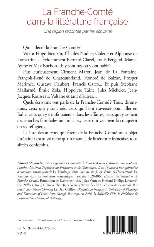 Qui a décrit la Franche-Comté ? Victor Hugo bien sûr, Charles Nodier, Colette et Alphonse de Lamartine... Évidemment Bernard Clavel, Louis Pergaud, Marcel Aymé et Max Buchon. Ils y sont nés ou y ont habité. Plus curieusement Clément Marot, Jean de La Fontaine, François-René de Chateaubriand, Honoré de Balzac, Prosper Mérimée, Gustave Flaubert, Francis Carco... Et puis Stéphane Mallarmé, Émile Zola, Hippolyte Taine, Jules Michelet, Jean- Jacques Rousseau, Voltaire et tant d'autres... Quels écrivains ont parlé de la Franche-Comté ? Tous, dirons- nous, ceux qui y sont nés, ceux qui l'ont traversée pour aller en Italie, ceux qui y « trafiquaient » dans les affaires, ceux qui y avaient des attaches familiales ou amicales, ceux qui venaient la conquérir ou s'y réfugier La liste des auteurs qui firent de la Franche-Comté un « objet littéraire » est aussi riche qu'un manuel de littérature française, tous siècles confondus.