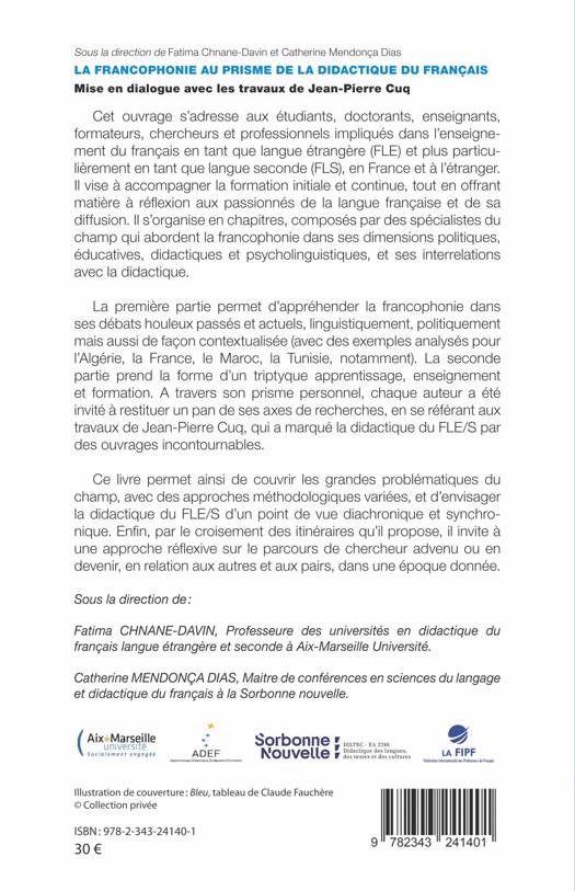 Cet ouvrage s'adresse aux étudiants, doctorants, enseignants, formateurs, chercheurs et professionnels impliqués dans l'enseignement du français en tant que langue étrangère (FLE) et plus particulièrement en tant que langue seconde (FLS), en France et à l'étranger. Il vise à accompagner la formation initiale et continue, tout en offrant matière à réflexion aux passionnés de la langue française et de sa diffusion. Il s'organise en chapitres, composés par des spécialistes du champ qui abordent la francophonie dans ses dimensions politiques, éducatives, didactiques et psycholinguistiques, et ses interrelations avec la didactique. La première partie permet d'appréhender la francophonie dans ses débats houleux passés et actuels, linguistiquement, politiquement mais aussi de façon contextualisée (avec des exemples analysés pour l'Algérie, la France, le Maroc, la Tunisie, notamment). La seconde partie prend la forme d'un triptyque apprentissage, enseignement et formation. A travers son prisme personnel, chaque auteur a été invité à restituer un pan de ses axes de recherches, en se référant aux travaux de Jean-Pierre Cuq, qui a marqué la didactique du FLE/S par des ouvrages incontournables.