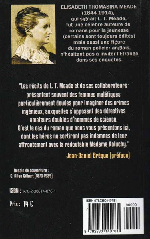 Les récits de L.T. Meade et de ses collaborateurs présentent souvent des femmes maléfiques particulièrement douées pour imaginer des crimes ingénieux, auxquelles s’opposent des détectives amateurs doublés d’hommes de science. C’est le cas du roman que nous vous présentons ici, dont les héros ne sortiront pas indemnes de leur affrontement avec la redoutable Madame Koluchy. »