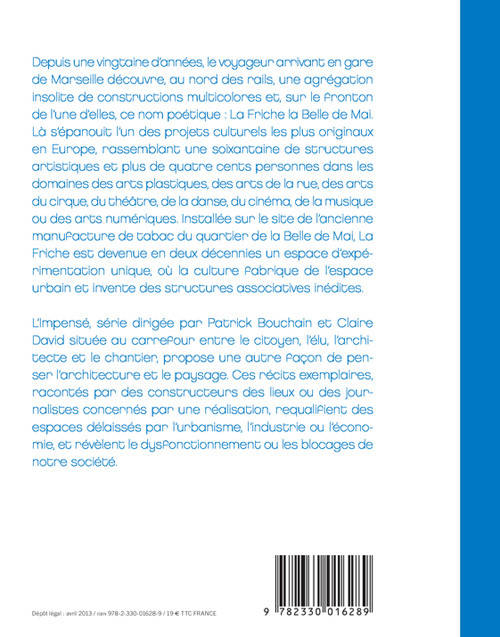 Depuis une vingtaine d'années, le voyageur arrivant en gare de Marseille découvre, au nord des rails, une agrégation insolite de constructions multicolores, et sur le fronton de l'une d'elles, ce titre poétique : La Friche la Belle de Mai. Il ne se doute pas que là s'épanouit l'un des projets culturels les plus originaux en Europe, rassemblant une soixantaine de structures artistiques et plus de quatre cents personnes dans les domaines des arts plastiques, des arts de la rue, des arts du cirque, du théâtre, de la danse, du cinéma, de la musique ou des arts numériques. Installée sur le site de l'ancienne manufacture de tabac du quartier de la Belle de Mai, La Friche est devenue en deux décennies un espace d'expérimentation unique, où la culture fabrique de l'espace urbain et invente des structures associatives inédites.