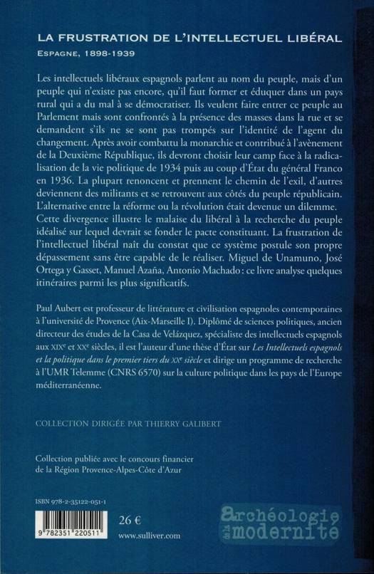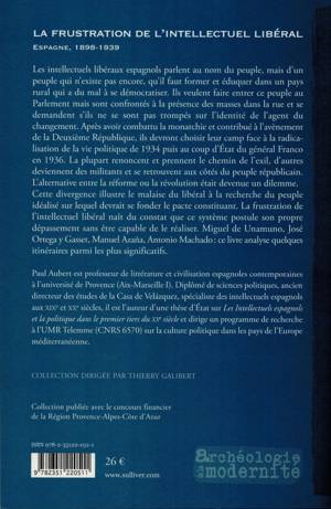 Les intellectuels libéraux espagnols parlent au nom d'un peuple qui n'existe pas encore, qu'il faut éduquer dans un pays rural qui a du mal à se démocratiser. Après avoir combattu la monarchie et contribué à l'avènement de la Deuxième République, ils devront choisir leur camp face à la radicalisation de la vie politique de 1934 puis au coup d'État du général Franco en 1936. La frustration naît d'un système qui postule son propre dépassement sans être capable de le réaliser. Miguel de Unamuno, José Ortega y Gasset, Manuel Azana, Antonio Machado : ce livre analyse quelques itinéraires significatifs.