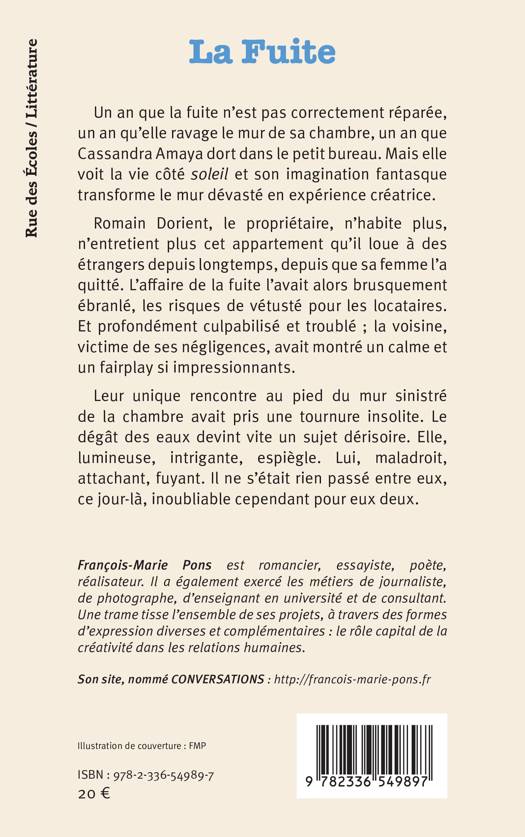 Un an que la fuite n'est pas correctement réparée, un an qu'elle ravage le mur de sa chambre, un an que Cassandra Amaya dort dans le petit bureau. Mais elle voit la vie côté soleil et son imagination fantasque transforme le mur dévasté en expérience créatrice. Romain Dorient, le propriétaire, n'habite plus, n'entretient plus cet appartement qu'il loue à des étrangers depuis longtemps, depuis que sa femme l'a quitté. L'affaire de la fuite l'avait alors brusquement ébranlé, les risques de vétusté pour les locataires. Et profondément culpabilisé et troublé; la voisine, victime de ses négligences, avait montré un calme et un fairplay si impressionnants. Leur unique rencontre au pied du mur sinistré de la chambre avait pris une tournure insolite. Le dégât des eaux devint vite un sujet dérisoire. Elle, lumineuse, intrigante, espiègle. Lui, maladroit, attachant, fuyant. Il ne s'était rien passé entre eux, ce jour-là, inoubliable cependant pour eux deux.
