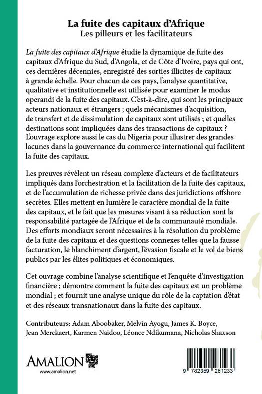La fuite des capitaux d’Afrique étudie la dynamique de fuite des capitaux d’Afrique du Sud, d’Angola, et de Côte d’Ivoire, pays qui ont, ces dernières décennies, enregistré des sorties illicites de capitaux à grande échelle. Pour chacun de ces pays, l’analyse quantitative, qualitative et institutionnelle est utilisée pour examiner le modus operandi de la fuite des capitaux. C’est-à-dire, qui sont les principaux acteurs nationaux et étrangers ; quels mécanismes d’acquisition, de transfert et de dissimulation de capitaux sont utilisés ; et quelles destinations sont impliquées dans des transactions de capitaux ? L’ouvrage explore aussi le cas du Nigeria pour illustrer des grandes lacunes dans la gouvernance du commerce international qui facilitent la fuite des capitaux. Les preuves révèlent un réseau complexe d’acteurs et de facilitateurs impliqués dans l’orchestration et la facilitation de la fuite des capitaux, et de l’accumulation de richesse privée dans des juridictions offshore secrètes. Elles mettent en lumière le caractère mondial de la fuite des capitaux, et le fait que les mesures visant à sa réduction sont la responsabilité partagée de l’Afrique et de la communauté mondiale. Des efforts mondiaux, avec un haut niveau de coordination, seront nécessaires à la résolution du problème de la fuite des capitaux et des questions connexes telles que la fausse facturation, le blanchiment d’argent, l’évasion fiscale et le vol de biens publics par les élites politiques et économiques. Cet ouvrage combine l’analyse scientifique et l’enquête d’investigation financière ; démontre comment la fuite des capitaux est un problème mondial ; et fournit une analyse unique du rôle de la captation d’état et des réseaux transnationaux dans la fuite des capitaux.