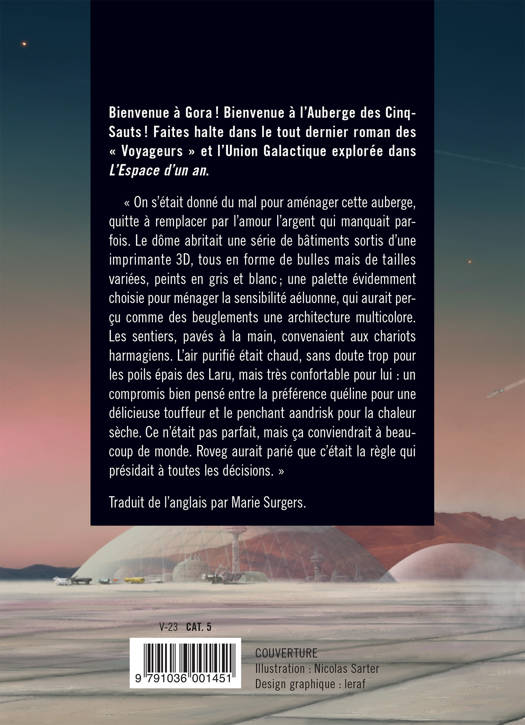 Bienvenue à Gora ! Bienvenue à l’Auberge des Cinq-Sauts ! Faites halte dans le tout dernier roman des « Voyageurs »et l’Union Galactique explorée dans L’Espace d’un an.