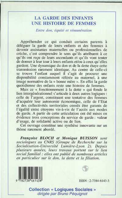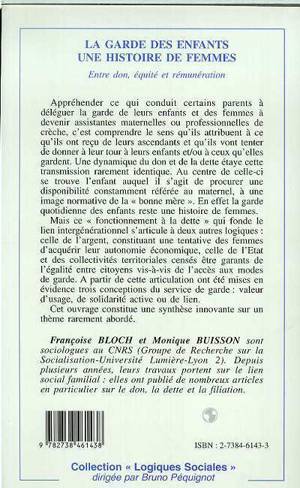 Appréhender ce qui conduit certains parents à déléguer la garde de leur enfants et des femmes à devenir assistantes maternelles ou professionnelles de crèche, c'est comprendre le sens qu'ils attribuent à ce qu'ils ont reçu de leurs ascendants et qu'ils vont tenter de donner à leur tour à leurs enfants et/ou à ceux qu'elles gardent. Une dynamique du don et de la dette étaye cette transmission rarement identique. Au centre de celle-ci se trouve l'enfant auquel il s'agit de procurer une image normative de la " bonne mère ". En effet, la garde quotidienne des enfants reste une histoire de femmes. Cet ouvrage constitue une synthèse innovante sur une thème rarement abordé.