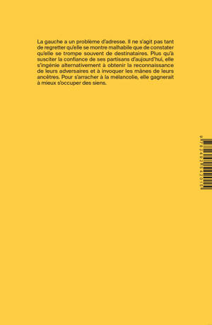 La gauche a un problème d’adresse. Il ne s’agit pas tant de regretter qu’elle se montre malhabile que de constater qu’elle se trompe souvent de destinataires. Plus qu’à susciter la confiance de ses partisans d’aujourd’hui, elle s’ingénie alternativement à obtenir la reconnaissance de leurs adversaires et à invoquer les mânes de leurs ancêtres. Pour s’arracher à la mélancolie, elle gagnerait à mieux s’occuper des siens. Ce sont ces trois textes qu’AOC a voulu réunir en un volume pour en faire l’un de ses « Imprimés ».