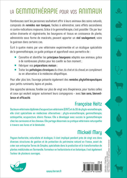 Nombreuses sont les personnes souhaitant offrir à leurs animaux des soins naturels, composés de remèdes non toxiques, faciles à administrer, sans effets secondaires ni contre-indications majeures. Grâce à la gemmothérapie, c’est possible ! De par leur action drainante et régénérante, les bourgeons et tissus en croissance de plante, administrés sous forme de macérats, peuvent apporter un réel soulagement, voire la guérison dans certains cas. Écrit par une vétérinaire expérimentée et un écologue spécialiste de la gemmothérapie, ce guide pratique et approfondi vous permettra de : connaître et identifier les principaux bourgeons adaptés aux animaux, grâce à de nombreuses photos pour les cueillir au bon moment ; fabriquer vos préparations maison ; traiter les pathologies chroniques du chien, du chat et du cheval, en complément ou en alternative à la médecine allopathique. Pour aller plus loin, l’ouvrage présente également des remèdes phytothérapeutiques pour petits ruminants, lapins et poules. Une approche sérieuse, fondée sur plus de vingt ans d’expérience, pour toutes celles et ceux qui veulent soigner autrement leurs compagnons – avec bon sens, bienveillance et efficacité.
