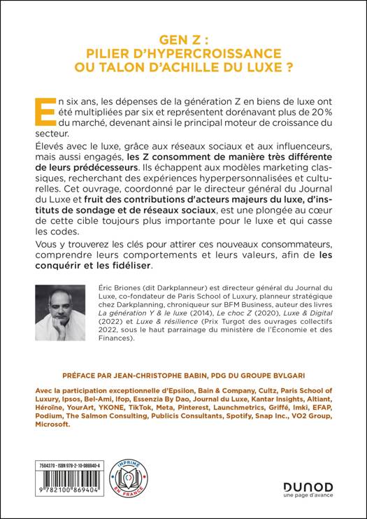 Élevés avec le luxe, grâce aux réseaux sociaux et aux influenceurs, mais aussi engagés, les Z consomment de manière très différente de leurs prédécesseurs. Ils échappent aux modèles marketing classiques, recherchant des expériences hyperpersonnalisées et culturelles. Cet ouvrage, coordonné par le directeur général du Journal du Luxe et fruit des contributions d'acteurs majeurs du luxe, d’instituts de sondage et de réseaux sociaux, est une plongée au coeur de cette cible toujours plus importante pour le luxe et qui casse les codes.