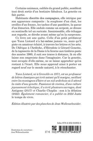 Certains animaux, oublies du grand public, semblent tout droit sortis d'un bestiaire fabuleux. La genette en fait partie. Habitante discrete des campagnes, elle intrigue par son apparence composite: la souplesse d'un chat, les oreilles d'un fennec, les taches d'une panthere, la queue d'un lemurien. Elle ondule comme un serpent, se dresse en sentinelle tel un suricate. Insaisissable, elle echappe aux regards, se derobe avant meme qu'on la surprenne. Ce livre est une quete. Celle d'un petit predateur que Yann Liotard n'a lui-meme jamais vu, mais qu'il piste en amateur eclaire, a travers les lettres et les arts. De l'Afrique a l'Ardeche, d'Herodote a Gerard Genette, de la tapisserie de la Dame a la licorne aux timbres-poste des annees 1980, il suit ses traces a distance, la ou elle laisse son empreinte dans l'imaginaire. Car la genette, tout occupee d'elle-meme, ne se laisse approcher qu'en restant a l'ecart. Elle nous apprend ainsi a porter un regard neuf sur le monde naturel, a le reenchanter. Edition illustree par des planches de Jean Wollenschneider.