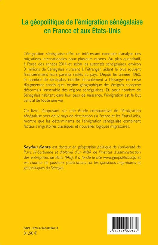 L'émigration sénégalaise offre un intéressant exemple d'analyse des migrations internationales. Ce livre, s'appuyant sur une étude comparative de l'émigration sénégalaise vers deux pays de destination (la France et les Etats-Unis), montre que les déterminants de l'émigration sénégalaise combinent facteurs migratoires classiques et nouvelles logiques migratoires.