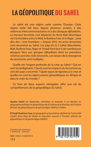Le sahel est une région vaste comme l'Europe. Cette région aride fait face, depuis plusieurs années, à des violences intercommunautaires et à des attaques djihadistes. La menace terroriste s'est déplacée du Nord Mali désertique vers la frontière entre le Mali, le Burkina Faso et le Niger : zone dite des « trois frontières ». Depuis 2012, les actes terroristes sont récurrents au Sahel. Les pays du G-5 Sahel (Mauritanie, Mali, Burkina Faso, Niger et Tchad) font face à de nombreuses attaques liées aux groupes djihadistes dont les premières victimes sont des civils innocents. Les raisons de la résurgence du terrorisme sont multiples. Quelle est l'origine profonde de la crise au Sahel ? Qui en sont les belligérants ? Quels sont les impacts du terrorisme au sein des pays concernés ? Quels types de ripostes à la crise et quelles en sont les répercussions géopolitiques en Afrique et dans le reste du monde ? Ce livre de deux experts sénégalais offre une clé de compréhension de la géopolitique du Sahel.