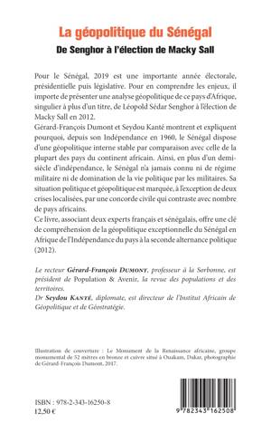 Pour le Sénégal, 2019 est une importante année électorale, présidentielle puis législative. Pour en comprendre les enjeux, il importe de présenter une analyse géopolitique de ce pays d'Afrique, singulier à plus d'un titre, de Léopold Sédar Senghor à l'élection de Macky Sall en 2012. Gérard-François Dumont et Seydou Kanté montrent et expliquent pourquoi, depuis son Indépendance en 1960, le Sénégal dispose d'une géopolitique interne stable par comparaison avec celle de la plupart des pays du continent africain.