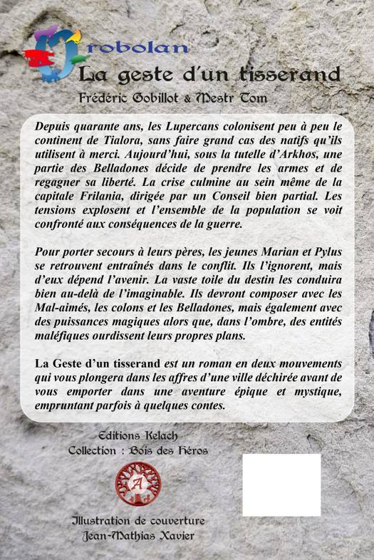 Depuis quarante ans, les Lupercans colonisent peu à peu le continent de Tialora, sans faire grand cas des natifs qu'ils utilisent à merci. Aujourd'hui, sous la tutelle d'Arkhos, une partie des Belladones décide de prendre les armes et de regagner sa liberté. La crise culmine au sein même de la capitale Frilania, dirigée par un Conseil bien partial. Les tensions explosent et l'ensemble de la population se voit confronté aux conséquences de la guerre. Pour porter secours à leurs pères, les jeunes Marian et Pylus se retrouvent entraînés dans le conflit. Ils l'ignorent, mais d'eux dépend l'avenir. La vaste toile du destin les conduira bien au-delà de l'imaginable. Ils devront composer avec les Mal-aimés, les colons et les Belladones, mais également avec des puissances magiques alors que, dans l'ombre, des entités maléfiques ourdissent leurs propres plans. La Geste d'un tisserand est un roman en deux mouvements qui vous plongera tout d'abord dans les affres d'une ville déchirée avant de vous emporter dans une aventure épique et mystique, empruntant parfois à quelques contes.
