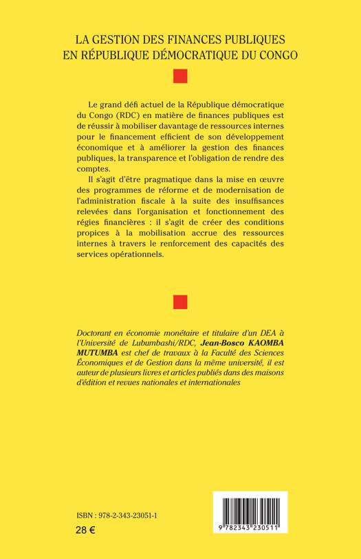 Le grand défi actuel de la République démocratique du Congo (RDC) en matière de finances publiques est de réussir à mobiliser davantage de ressources internes pour le financement efficient de son développement économique et à améliorer la gestion des finances publiques, la transparence et l'obligation de rendre des comptes. Il s'agit d'être pragmatique dans la mise en oeuvre des programmes de réforme et de modernisation de l'administration fiscale à la suite des insuffisances relevées dans l'organisation et fonctionnement des régies financières et de créer des conditions propices à la mobilisation accrue des ressources internes à travers le renforcement des capacités des services opérationnels.