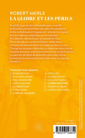 La prise de La Rochelle, en 1628, par Louis XIII et Richelieu, fut un événement considérable. Dernier acte des affrontements entre catholiques et huguenots, elle sonna le glas des entreprises anglaises sur le continent. A l'intérieur, elle renforça la royauté et l'Etat, ambition majeure du cardinal-ministre. Le comte d'Orbieu (Pierre de Siorac, ami du roi depuis l'enfance de ce dernier) relate à la première personne, dans un français robuste et dru que n'a pas encore épuré l'Académie, ce siège qui dure un an, et dont l'élément clé est la gigantesque digue qui, barrant la baie, interdit tout secours à la ville. Dans les intervalles de missions aussi délicates que périlleuses - l'une l'amène à l'intérieur mème de la ville assiégée -, le fidèle serviteur du roi n'oublie pas son amour pour le gentil sesso. La pensée de Mme de Brezolles peut-elle suffire à conjurer les rencontres bec à bec avec la coquine Perrette ? Le onzième volume - toujours aussi entraînant, aussi riche de personnages et de péripéties - de la saga Fortune de France.