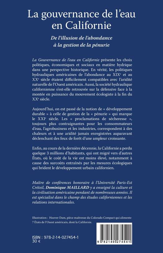 Cet ouvrage présente les choix politiques, économiques et sociaux en matière hydrique dans une perspective historique. En vérité, les politiques hydrauliques américaines de l'abondance au XIXe et au XXe siècles étaient difficilement compatibles avec l'aridité naturelle de l'Ouest américain. Aussi, la société hydraulique californienne s'est-elle retrouvée sur la défensive face à la montée en puissance du mouvement écologiste à la fin du XXe siècle. Aujourd'hui, on est passé du "développement durable" à la gestion de la "pénurie" qui marque le XXIe siècle. Les "proclamations de sécheresse", toujours plus contraignantes pour les consommateurs d'eau et les industries, correspondent à des chaleurs et à une aridité jamais enregistrées jusqu'ici et déclenchant des feux de forêt d'une ampleur croissante. Enfin, au cours de la dernière décennie, la Californie a perdu 3 millions d'habitants, qui ont migré vers d'autres Etats, où le coût de la vie est moins élevé, notamment à cause des surcoûts causés par les mesures écologiques qui brident le développement urbain.