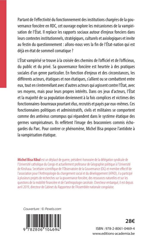 Ce livre du Professeur Michel Bisa Kibul traite de la gouvernance foncière dans un État en crise où la gouvernance foncière se bute à des pratiques sociales de genre particulier. Les différents acteurs, privés et publics, officiels et officieux, nationaux et étrangers agissent contre l'État, avec les moyens de l'État mais, pour leurs propres intérêts. Ces fonctionnaires publics reflètent l'image des « anti-virus corrompus qui répandent dans le système étatique des germes vampirisateurs ». D'où la question : allons-nous vers la fin de l'État-nation ? Michel Bisa, tente de répondre à cette question en proposant l'antidote au phénomène de la vampirisation de l'État.