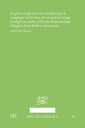 « La grâce surgit aussi en marchant par la campagne ou les rues, en croisant un visage étranger ou connu, à l’écoute d’une musique échappée d’une fenêtre entrouverte. » Colette Nys-Mazure nous offre dans cet ouvrage, une réflexion sur la grâce, nourrie dès l’enfance par ses premiers émerveillements devant la nature, mais aussi ressentie au fil du temps de manière quotidienne, lors d’une simple rencontre, celle d’une silhouette furtivement aperçue ou d’œuvres d’art aux résonances inoubliables. Elle nous livre également une réflexion sur le rôle fondamental de la poésie vécue, enrichie par la lecture et l’écriture. Après « Le Plâtrier siffleur » de Christian Bobin, « Le Mouvement géopoétique » de Kenneth White, « Des oasis de poésie » de Edgar Morin, « La Rencontre et la Grâce » rejoint une collection de Poesis qui vient convaincre les initiés comme les néophytes de l’importance d’« habiter poétiquement le monde ». Colette Nys-Mazure est née à Wavre et vit à Tournai en Belgique. Diplômé