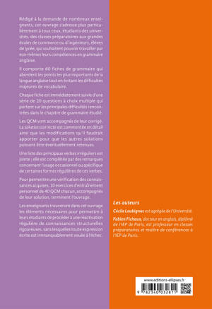 Chaque fiche est immédiatement suivie d'une série de 20 questions à choix multiple qui portent sur les principales difficultés rencontrées dans le chapitre de grammaire étudié. Les QCM sont accompagnés de leur corrigé. La solution correcte est commentée en détail ainsi que les modifications qu'il faudrait apporter pour que les autres solutions puissent être éventuellement retenues.