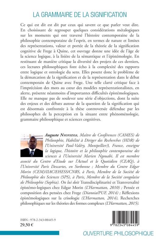 Le livre d'Auguste Nsonsissa s'inscrit dans la philosophie contemporaine du langage. Il construit un dialogue entre Quine et Frege autour de la question de la place des représentations dans la théorie de la signification. Au-delà de cette querelle de fondements, l'auteur montre que de l'intérieur même du langage se trouve postulée une philosophie de l'esprit qui réévalue la philosophie des relations entre la perception, la grammaire de la signification de la pensée et la cognition. Donc, langage, argumentation et cognition sont toujours tenues ensemble dans la tradition sémantique et épistémologique de notre temps.