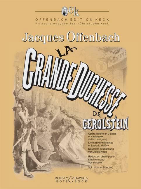 Après le succès exceptionnel de La belle Hélène (1864) et de La Vie Parisienne (1866), le triumvirat Offenbach/Meilhac/Halévy atteint en 1867 avec La Grande Duchesse de Gérolstein le zénith de sa notoriété. Mais ce ne fut qu’au prix de coupures et de révisions radicales. Aucune Offenbachiade ne fut soumise autant qu’elle au stylo rouge, pour aller au-devant du goût du public de l’époque. Par là, le grand opéra bouffe romantique plein de sous-entendus et d’ambivalences se métamorphosa en la parodie militaire que l’on connaissait jusqu’à la redécouverte de la version originale en 2004 au Théâtre du Châtelet, avec les Musiciens du Louvre sous la direction de Marc Minkowski et Felicity Lott dans le rôle-titre. L’édition critique et pratique OEK (Offenbach Edition Keck) a rendu disponible pour la première fois dans sa totalité La Grande Duchesse de Gérolstein “originale”, telle qu‘Offenbach et ses librettistes l’avaient conçue au départ. Après avoir fait ses preuves dans de nombreuses productions scéniques, cette édition paraît maintenant sous forme de chant-piano. Celui-ci documente non seulement la version de la partition autographe mais aussi les versions établies par Offenbach pour les premières ultérieures de Vienne et Berlin, avec toutes les modifications formelles et musicales. Les quatre versions principales du livret sont documentées en annexe. Instrumentation: soloists, choir and orchestra