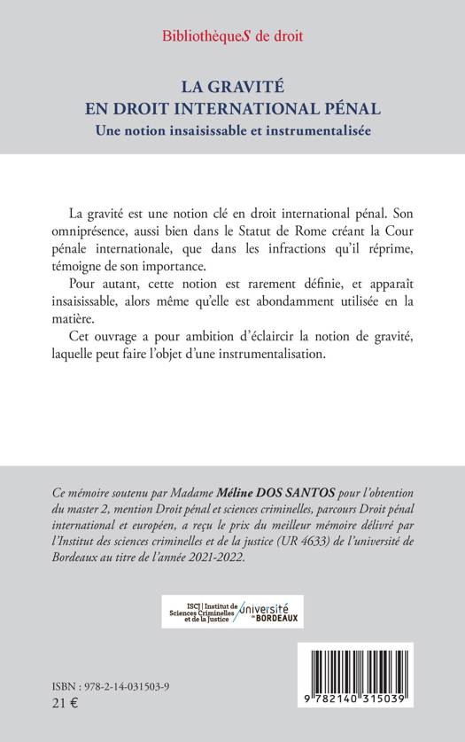 La gravité est une notion clé en droit international pénal. Son omniprésence, aussi bien dans le Statut de Rome créant la Cour pénale internationale, que dans les infractions qu'il réprime, témoigne de son importance. Pour autant, cette notion est rarement définie, et apparaît insaisissable, alors même qu'elle est abondamment utilisée en la matière. Cet ouvrage a pour ambition d'éclaircir la notion de gravité, laquelle peut faire l'objet d'une instrumentalisation.