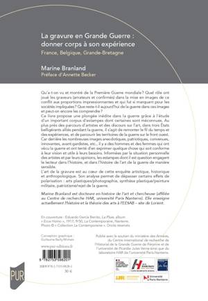 Ce livre propose une plongée inédite dans la guerre grâce à l’étude d’un important corpus d’estampes dont certaines sont méconnues. Au plus près des parcours d’artistes et des discours sur l’art, dans trois États belligérants alliés pendant la guerre, il s’agit de remonter le fil du temps et des expériences, et de parcourir les territoires de la guerre sur le front ouest. Car derrière les nombreuses images anecdotiques, patriotiques, convenues, innovantes, avant-gardistes, etc., il y a des hommes et des femmes qui ont vécu la guerre et ont tenté d’en exprimer quelque chose qui soit conforme à leur vision et utile à leurs besoins. Informées par la situation personnelle des artistes et par leurs opinions, les estampes dont il est question engagent le lecteur dans l’histoire, et dans l’histoire de l’art de la guerre de manière sensible.
