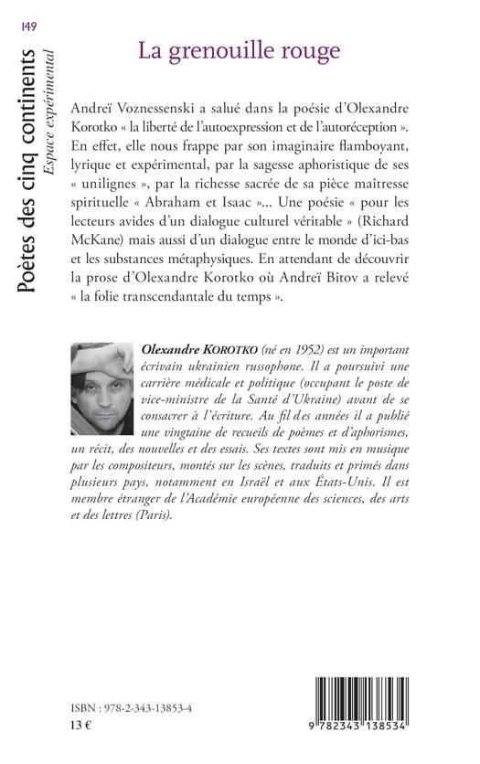 La poésie Olexandre Korotko est saluée pour sa liberté d'autoexpression et d'autoréception. Elle frappe le lecteur par son imaginaire flamboyant, lyrique et expérimental, par la sagesse aphoristique de ses "unilignes" et par la richesse sacrée de sa pièce maitresse sprirituelle " Abraham et Isaac."