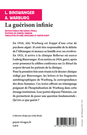 En 1918, Aby Warburg est frappé d'une crise de psychose aiguë : il croit être responsable de la défaite de l'Allemagne et menace sa famille avec un revolver. En 1921, il arrive à la clinique Bellevue où exerce Ludwig Binswanger. Il en sortira en 1924, guéri, après avoir prononcé, la célèbre conférence sur «Le rituel du serpent» devant les patients de la clinique. Pour la première fois sont réunis ici le dossier clinique rédigé par Binswanger, les lettres et les fragments autobiographiques de Warburg, la correspondance des deux hommes. Ces textes offrent un témoignage poignant de l'hospitalisation de Warburg dans cette étrange institution. Leur portée dépasse l'histoire, car ils permettent de poser une question fondamentale : qu'est-ce que guérir?