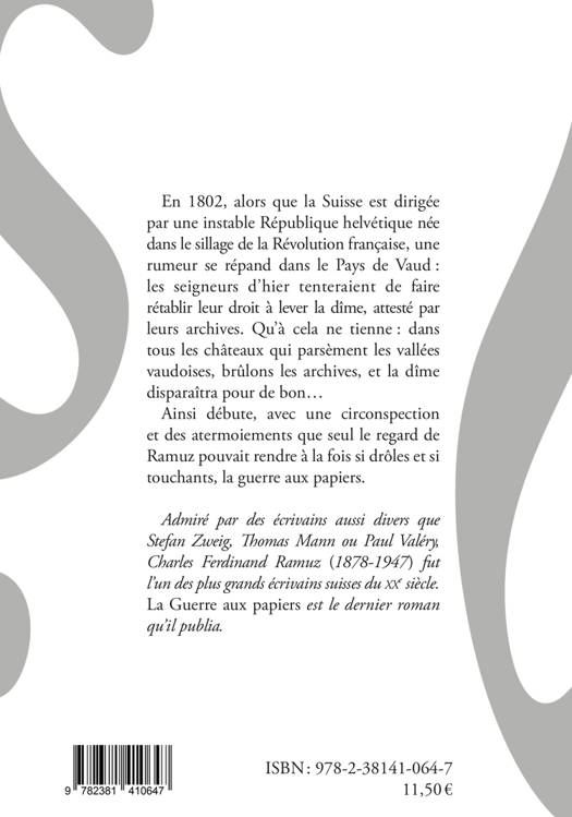 Admiré par des écrivains aussi divers que Stefan Zweig, Thomas Mann ou Paul Valéry, Charles Ferdinand Ramuz (1878-1947) fut l’un des plus grands écrivains suisses du xxe siècle. La Guerre aux papiers est le dernier roman qu’il publia.