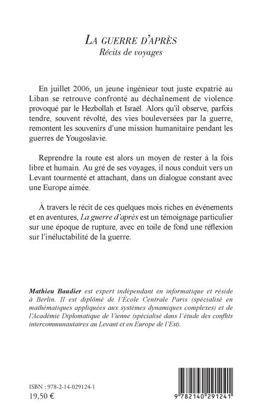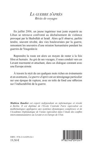 En juillet 2006, un jeune ingénieur tout juste expatrié au Liban se retrouve confronté au déchaînement de violence provoqué par le Hezbollah et Israël. Alors qu'il observe, parfois tendre, souvent révolté, des vies bouleversées par la guerre, remontent les souvenirs d'une mission humanitaire pendant les guerres de Yougoslavie. Reprendre la route est alors un moyen de rester à la fois libre et humain. Au gré de ses voyages, il nous conduit vers un Levant tourmenté et attachant, dans un dialogue constant avec une Europe aimée. À travers le récit de ces quelques mois riches en événements et en aventures, La guerre d'après est un témoignage particulier sur une époque de rupture, avec en toile de fond une réflexion sur l'inéluctabilité de la guerre.