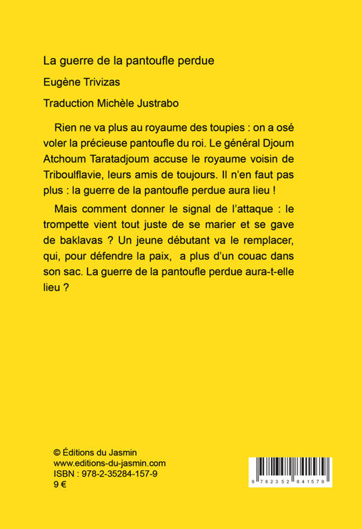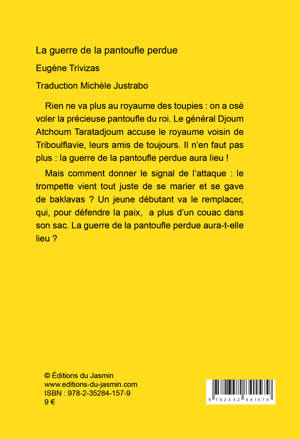 Rien ne va plus au royaume des toupies : on a osé voler la précieuse pantoufle du roi. Le général Djoum Atchoum Taratadjoum accuse le royaume voisin de Triboulflavie, leurs amis de toujours. Il n’en faut pas plus : la guerre est déclarée ! Mais comment donner le signal de l’attaque ? le trompette vient tout juste de se marier et se gave de baklavas. Un jeune débutant va le remplacer, qui, pour défendre la paix, a plus d’un couac dans son sac. La guerre de la pantoufle perdue aura-telle lieu ?