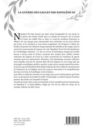 Napoléon III était fasciné par Jules César. L'originalité de son étude de la guerre des Gaules réside dans sa volonté de retrouver sur le terrain les traces du conflit. Pour ce faire, il a réuni les meilleurs historiens et officiers de son époque pour entreprendre des recherches sur les lieux décrits par César, et les résultats se sont avérés stupéfiants. De Gergovie à Alésia, les fouilles ont permis de confirmer chaque épisode des batailles et des sièges, tout en suivant les mouvements de troupes. En cela, Napoléon III est l'un des fondateurs de l'archéologie nationale ; il a mis en oeuvre la fantastique énergie des érudits locaux à travers toute la France, envoyant des troupes pour vérifier certains itinéraires des légions de César ou à faire reconstruire les machines de guerre romaines pour les expérimenter. Pionnière, cette fantastique aventure collective nous stupéfie, tant par les moyens dont elle put disposer en son temps que par les progrès scientifiques qu'elle a suscités, et que nul ne saurait aujourd'hui renier. La lecture que fait Napoléon III du Bellum Gallicum de César reflète le constant souci de l'empereur de ne négliger aucun des aspects nécessaires à la compréhension du texte, des faits, de la politique et des hommes. Loin d'être un objet de curiosité, cet ouvrage reste, par les informations qu'il nous livre, un document d'actualité. En effet, l'archéologie a confirmé depuis l'extrême justesse des études sur lesquelles il repose. Un atlas de trente-deux cartes est reproduit, et il est complété par les commentaires de Napoléon Ier à Sainte-Hélène, rédigé par l'un de ses aides de camp, sur la tactique militaire de Jules César.