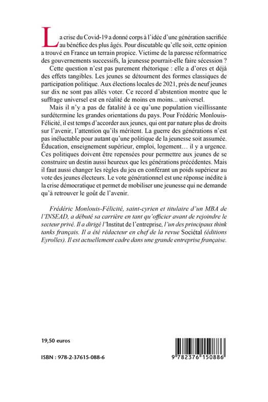Mais il n’y a pas de fatalité à ce qu’une population vieillissante surdétermine les grandes orientations du pays. Pour Frédéric Monlouis-Félicité, il est temps d’accorder aux jeunes, qui ont par nature plus de droits sur l’avenir, l’attention qu’ils méritent. La guerre des générations n’est pas inéluctable pour autant qu’une politique de la jeunesse soit assumée. Éducation, enseignement supérieur, emploi, logement… il y a urgence. Ces politiques doivent être repensées pour permettre aux jeunes de se construire un destin aussi heureux que les générations précédentes. Mais il faut aussi changer les règles du jeu en conférant un poids supérieur au vote des jeunes électeurs. Le vote générationnel est une réponse inédite à la crise démocratique et permet de mobiliser une jeunesse qui ne demande qu’à retrouver le goût de l’avenir.