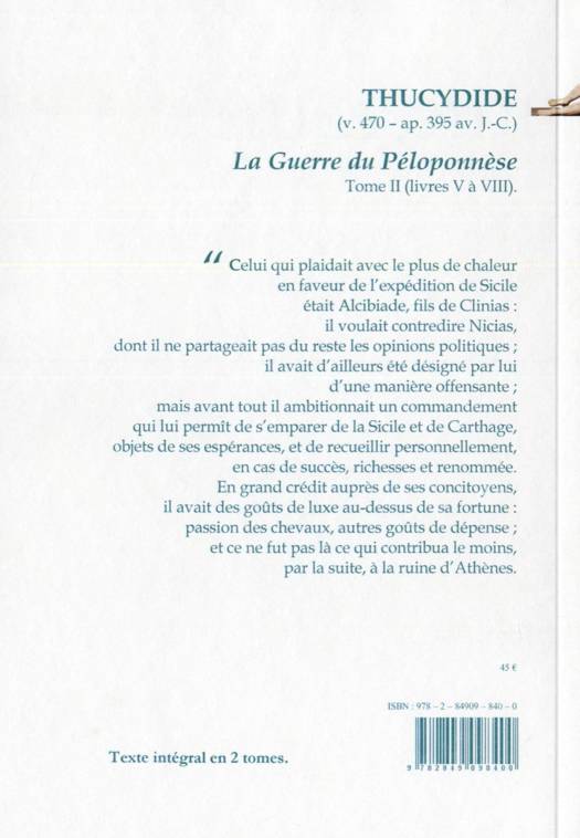 Mon âge m'a permis de traverser cette guerre de bout en bout avec la maturité d'esprit nécessaire à la compréhension des faits. Exilé de ma patrie pendant vingt ans après ma campagne d'Amphipolis, témoin des événements chez les deux peuples, notamment les Lacédémoniens, j'ai eu ainsi tout le loisir de prendre connaissance de ce qui se passait... Car cette guerre fut le plus vaste mouvement qui jamais se soit produit chez les Grecs ; il embrassa une partie des barbares, et ébranla pour ainsi dire au loin l'univers.