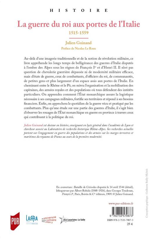 Au-delà d'une imagerie traditionnelle et de la notion de révolution militaire, ce livre appréhende les longs temps de belligérance des guerres d'Italie disputés à l'ombre des Alpes sous les règnes de François Ier et d'Henri II. Il n'est pas question de chevalerie guerrière dépassée ni de modernité militaire efficace, mais d'états de guerre, ceux de combattants, d'officiers du roi, de communautés, de petites gens et plus largement d'un espace assis aux portes de l'Italie. En cheminant entre le Rhône et le Pô, on suivra l'organisation et la mobilisation des capitaines, des armées royales et des populations où tous défendent des intérêts particuliers. On apprendra comment l'Etat monarchique assure la logistique nécessaire à ses campagnes militaires, fortifie ses territoires et répond à ses besoins financiers. Enfin, on approchera le quotidien de la guerre vécu et pratiqué par les combattants. Plus qu'une étude sur une partie des guerres d'Italie, il s'agit bien d'observer les rouages de l'Etat monarchique en guerre en province à travers ceux qui contribuent à la politique du roi.