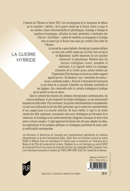 L’invasion de l’Ukraine en février 2022 s’est accompagnée de la résurgence de débats sur le caractère « hybride » de la guerre menée par la Russie contre ce pays et ses soutiens. Guerre informationnelle et cyberattaques, chantage à l’énergie et sanctions économiques, utilisation du levier alimentaire à destination des États du « Sud Global » : autant de modalités accompagnant la stratégie mise en oeuvre par la Russie mais aussi par certains États alliés de l’Ukraine. Le concept de « guerre hybride » formulé par la pensée militaire au cours des conflits menés par les États-Unis en Irak et en Afghanistan, souffre néanmoins de son caractère évanescent et polysémique. Mobilisé dans les discours stratégiques russes, européens et américains, il se rapporte autant à la campagne d’annexion de la Crimée qu’aux actions menées par l’Organisation État islamique ou encore au soutien supposé apporté par les « Occidentaux » aux « révolutions de couleur » ou aux « printemps arabes ». Ainsi est-il nécessaire de circonscrire ce qui relève de ce concept, d’identifier ses éléments constitutifs et ses logiques, d’en comprendre enfin le contexte stratégique et juridique qui en permet la mise en oeuvre. Dans le contexte des tensions des relations internationales contemporaines, les sciences politiques, et plus largement les études stratégiques, se sont précocement emparées de cette notion. Plus récemment, les juristes internationalistes et européanistes s’y sont aussi intéressés du fait des défis particuliers que la notion (ses représentations et ses usages) pose à la sécurité collective. De façon inédite, il s’agit ici de rendre compte des défis empiriques, conceptuels mais aussi stratégiques qui découlent de la subversion, du brouillage ou du contournement des catégories classiques du droit et des autres sciences sociales. Il s’agit également de donner des clés pour adapter les idées, les organisations et les pratiques politiques ou stratégiques permettant de mieux saisir la conflictualité contemporaine.