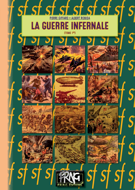 Que sera la prochaine guerre ? Entre quelles nations éclatera-t-elle ? Comment s’engageront les hostilités ? Où seront les champs de bataille ? A quels engins de destruction les belligérants auront-ils recours ? Jusqu’où sera poussée l’atrocité de leurs effets ? Autant de questions que petits et grands se posent, en France comme ailleurs, non sans quelque anxiété. C’est pour répondre à ce désir de savoir ce que nous réserve l’avenir, que l’amusant conteur Pierre Giffard et le prestigieux dessinateur Robida ont écrit et illustré cette nouvelle publication. Il semble indubitable que le conflit armé dont la planète est menacée sera le plus horrible que l’humanité ait jamais eu depuis le commencement des siècles. Ce sera vraiment LA GUERRE INFERNALE, assez atroce pour rendre désormais impossibles toutes les guerres. Et au moment où des fous prêchent l’antipatriotisme, au moment où d’autres fous rêvent de déchaîner sur leur pays, pour des motifs futiles, toutes les calamités d’un pareil fléau, nous croyons que l’heure est venue de montrer ce que doit être, ce que sera la prochaine guerre, LA GUERRE INFERNALE. Il faut lire ce roman d’aventures extraordinaires, où s’associent les facultés de vulgarisation divinatrice de Pierre Giffard et les coups de crayon prophétiques de Robida (Présentation d’époque, 1908). La Guerre infernale est parue en fascicules hebdomadaires (30) en 1908 et la même année en 2 tomes puis en 1 seul tome. Une réédition en a été faite en 2002 en 3 tomes. En tout, près de 1000 pages, 500 illustrations en NB et 30 couvertures en couleurs !