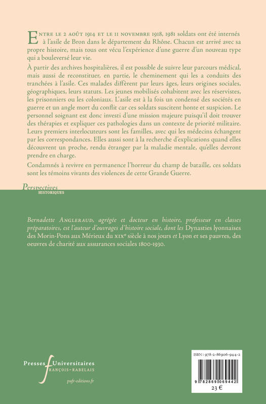 Entre le 2 août 1914 et le 11 novembre 1918, 1981 soldats ont été internés à l’asile de Bron dans le département du Rhône. Chacun est arrivé avec sa propre histoire, mais tous ont vécu l’expérience d’une guerre d’un nouveau type qui a bouleversé leur vie. À partir des archives hospitalières, il est possible de suivre leur parcours médical, mais aussi de reconstituer, en partie, le cheminement qui les a conduits des tranchées à l’asile. Ces malades diffèrent par leurs âges, leurs origines sociales, géographiques, leurs statuts. Les jeunes mobilisés cohabitent avec les réservistes, les prisonniers ou les coloniaux. L’asile est à la fois un condensé des sociétés en guerre et un angle mort du conflit car ces soldats suscitent honte et suspicion. Le personnel soignant est donc investi d’une mission majeure puisqu’il doit trouver des thérapies et expliquer ces pathologies dans un contexte de priorité militaire. Leurs premiers interlocuteurs sont les familles, avec qui les médecins échangent par les correspondances. Elles aussi sont à la recherche d’explications quand elles découvrent un proche, rendu étranger par la maladie mentale, qu’elles devront prendre en charge. Condamnés à revivre en permanence l’horreur du champ de bataille, ces soldats sont les témoins vivants des violences de cette Grande Guerre.