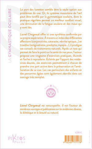 Le port des lunettes semble être la seule option aux problèmes de vue. Or, le système musculaire de l'œil peut être tonifié par la gymnastique oculaire, dont la pratique régulière permet un meilleur confort visuel, une diminution de la fatigue oculaire et des maux qui y sont liés. Lionel Clergeaud offre ici une synthèse confirmée par sa propre expérience. À travers un index des différentes affections (conjonctivite, cataracte, névrite optique…) et troubles (astigmatisme, presbytie, myopie…), il prodigue ses conseils de traitements naturels. Après un test qui permet de faire le point sur la santé de nos yeux, l'auteur propose une vingtaine d'exercices pratiques, illustrés et faciles à reproduire. Éclairés par l'apport des médecines douces, ces exercices permettront à chacun de prendre une part active dans la préservation et l'amélioration de sa vue. Les cas particuliers des enfants et des personnes âgées sont également abordés dans cet ouvrage très complet.