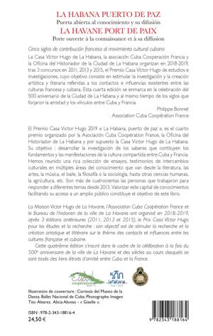 El Premio Casa Victor Hugo 2019 « La Habana, puerto de paz », es el cuarto premio organizado por la Asociación Cuba Coopération France, la Oficina del Historiador de La Habana y por supuesto la Casa Victor Hugo de La Habana. Su objetivo : desarrollar la investigación de los saberes que contituyen los fundamentos y las manifestaciones de la cultura compartida entre Cuba y Francia. Hemos reunido una rica colección de ensayos, testimonios de intercambios culturales en múltiples áreas del conocimiento que van desde la literatura, las artes, la música, el baile, la filosofía o la sociología, hasta otras ciencias humanas, la agricultura, etc. Son más de cuatrocientas las personas que trabajaron para responder a diferentes temas desde 2013. Valorizar este capital de conocimientos facilitando su acceso a un amplio público constituye el objetivo de este libro.