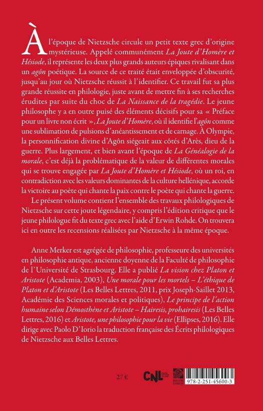 À l’époque de Nietzsche circule un petit texte grec d’origine mystérieuse. Appelé communément La Joute d’Homère et Hésiode, il représente les deux plus grands auteurs épiques rivalisant dans un agôn poétique. La source de ce traité était enveloppée d’obscurité, jusqu’au jour où Nietzsche réussit à l’identifier. Ce travail fut sa plus grande réussite en philologie, juste avant de mettre fin à ses recherches érudites par suite du choc de La Naissance de la tragédie. Le jeune philosophe y a en outre puisé des éléments décisifs pour sa « Préface pour un livre non écrit », La Joute d’Homère, où il identifie l’agôn comme une sublimation de pulsions d’anéantissement et de carnage. À Olympie, la personnification divine d’Agôn siégeait aux côtés d’Arès, dieu de la guerre. Plus largement, et bien avant l’époque de La Généalogie de la morale, c’est déjà la problématique de la valeur de différentes morales qui se trouve engagée par La Joute d’Homère et Hésiode, où un roi, en contradiction avec les valeurs dominantes de la culture hellénique, accorde la victoire au poète qui chante la paix contre le poète qui chante la guerre. Le présent volume contient l’ensemble des travaux philologiques de Nietzsche sur cette joute légendaire, y compris l’édition critique que le jeune philologue fit du texte grec avec l’aide d’Erwin Rohde. On trouvera ici en outre les recensions réalisées par Nietzsche à la même époque.