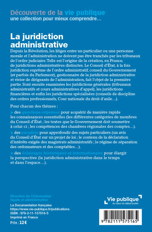 Cet ouvrage présente les trois « piliers » qui constituent la juridiction administrative française : le Conseil d’État (CE), les juridictions générales (tribunaux administratifs et cours administratives d’appel) et les juridictions spéciales (ex. Cour nationale du droit d’asile). Il expose, de manière claire et approfondie, leur articulation entre elles mais aussi leur place centrale dans l’élaboration de la loi ou la résolution des conflits entre usagers et administration.