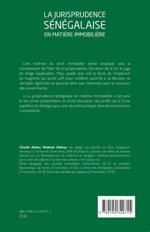 Une maîtrise du droit immobilier serait utopique sans la connaissance de l'état de la jurisprudence. Serviteur de la loi, le juge en dirige l'application. Mais, quelle que soit la force de l'impérium du magistrat qui aurait suffi pour conférer autorité à sa décision, sa véritable légitimité ne pourrait être que renforcée avec le concours des universitaires. La jurisprudence sénégalaise en matière immobilière est ainsi le lieu d'une présentation et d'une discussion des arrêts de la Cour suprême du Sénégal pour une sécurité juridique dans les transactions immobilières.
