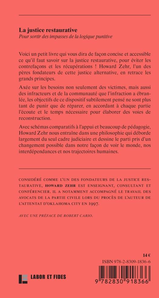 Vous avez aimé le film Je verrai toujours vos visages de Jeanne Henry (2023) ? Alors voici un petit livre qui vous dira de façon concise et accessible ce qu’il faut savoir sur la justice restaurative, pour éviter les contrefaçons et les récupérations ! Howard Zehr, l’un des pères fondateurs de cette justice alternative, en retrace les grands principes. Axée sur les besoins non seulement des victimes, mais aussi des infracteurs et de la communauté que l’infraction a ébranlée, les objectifs de ce dispositif subtilement pensé ne sont plus tant de punir que de réparer, en accordant à chaque partie l’écoute et le temps nécessaire pour élaborer des voies de reconstruction. Avec schémas comparatifs à l’appui et beaucoup de pédagogie, Howard Zehr nous entraîne dans une philosophie qui déborde largement du seul cadre judiciaire et dessine le parti pris d’un changement possible dans notre façon de voir le monde, nos interdépendances et nos trajectoires humaines.