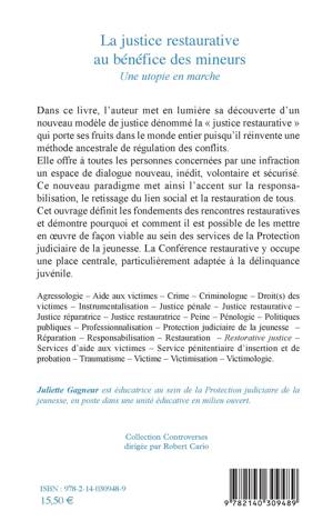 Dans ce livre, l'auteur met en lumière sa découverte d'un nouveau modèle de justice dénommé la justice restaurative qui porte ses fruits dans le monde entier puisqu'il réinvente une méthode ancestrale de régulation des conflits. Elle offre à toutes les personnes concernées par une infraction un espace de dialogue nouveau, inédit, volontaire et sécurisé. Ce nouveau paradigme met ainsi l'accent sur la responsabilisation, le retissage du lien social et la restauration de tous. Cet ouvrage définit les fondements des rencontres restauratives et démontre pourquoi et comment il est possible de les mettre en oeuvre de façon viable au sein des services de la Protection judiciaire de la jeunesse. La Conférence restaurative y occupe une place centrale, particulièrement adaptée à la délinquance juvénile.