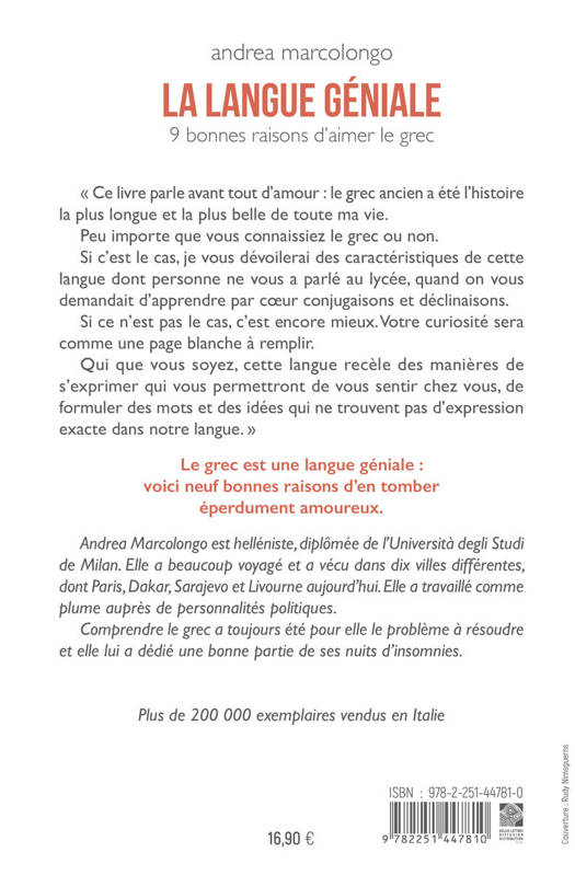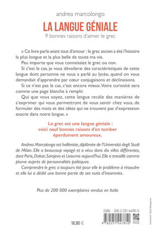 Ce livre parle avant tout d'amour: le grec ancien a ete l'histoire la plus longue et la plus belle de toute ma vie.Peu importe que vous connaissiez le grec ou non.Si c'est le cas, je vous devoilerai des caracteristiques de cette langue dont personne ne vous a parle au lycee, quand on vous demandait d'apprendre par coeur conjugaisons et declinaisons.Si ce n'est pas le cas, c'est encore mieux. Votre curiosite sera comme une page blanche a remplir.Qui que vous soyez, cette langue recele des manieres de s'exprimer qui vous permettront de vous sentir chez vous, de formuler des mots et des idees qui ne trouvent pas d'expression exacte dans notre langue. Le grec est une langue geniale: voici neuf bonnes raisons d'en tomber eperdument amoureux.
